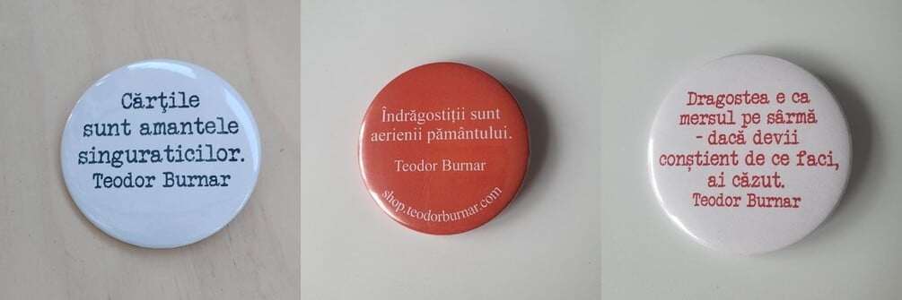 Primești o insignă personalizată, ce poate fi inscripționată cu citatul dorit, ales de tine, din creația lui Teodor Burnar.